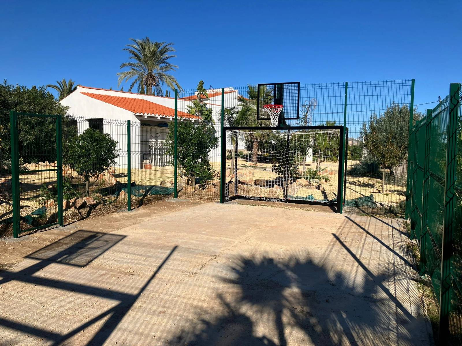 The villa has a large swimming pool with a shallow end, as well as a fenced sports field with goals. The garden is fully enclosed with a wall, a gate and a large gate, making it a safe and spacious play area. In addition, there is a cot and a high chair. In most bedrooms there is enough space to add a cot.